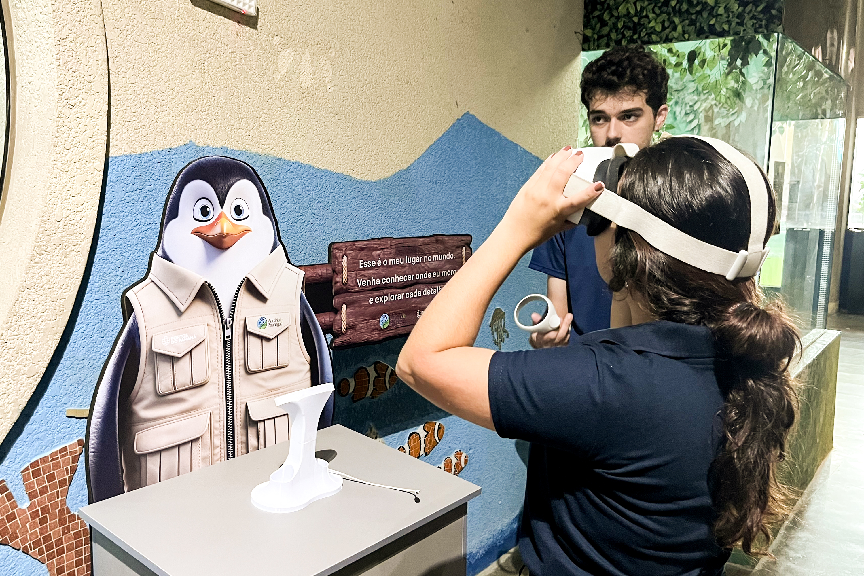No mesmo espaço, foram disponibilizados óculos de realidade virtual, permitindo que os visitantes visualizem as aves em seu ambiente natural. Existem cerca de 18 espécies de pinguins descritas no mundo e, ao contrário do que muitos imaginam, apenas cinco vivem no gelo. Ainda assim, todas habitam ambientes frios como as praias da Patagônia, onde as temperaturas variam entre 10°C e 15°C durante a maior parte do ano.